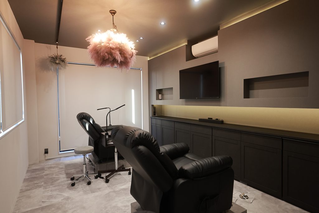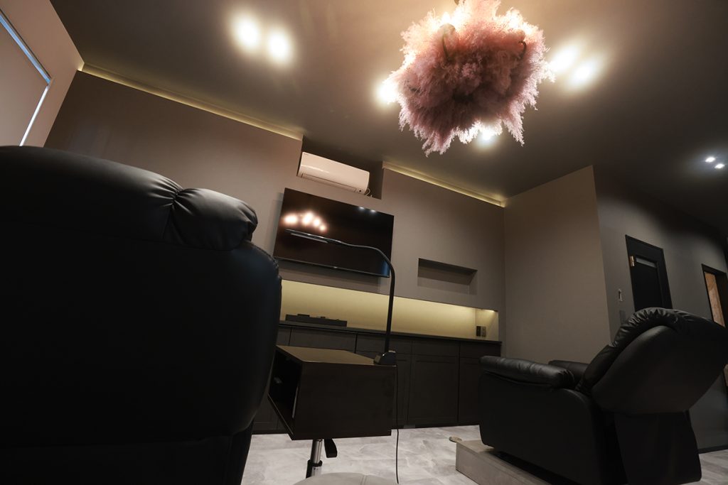全体にグレーを基調とし、シックで落ち着いた空間のあちこちにフラワーシャンデリアがあります。